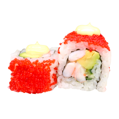 tobiko kaviár, avokádo, uhorka, krevety, japonská majonéza, sushi ryža, morská riasa, wasabi, nakladaný zázvor, sójová omáčka, goma wakame riasa