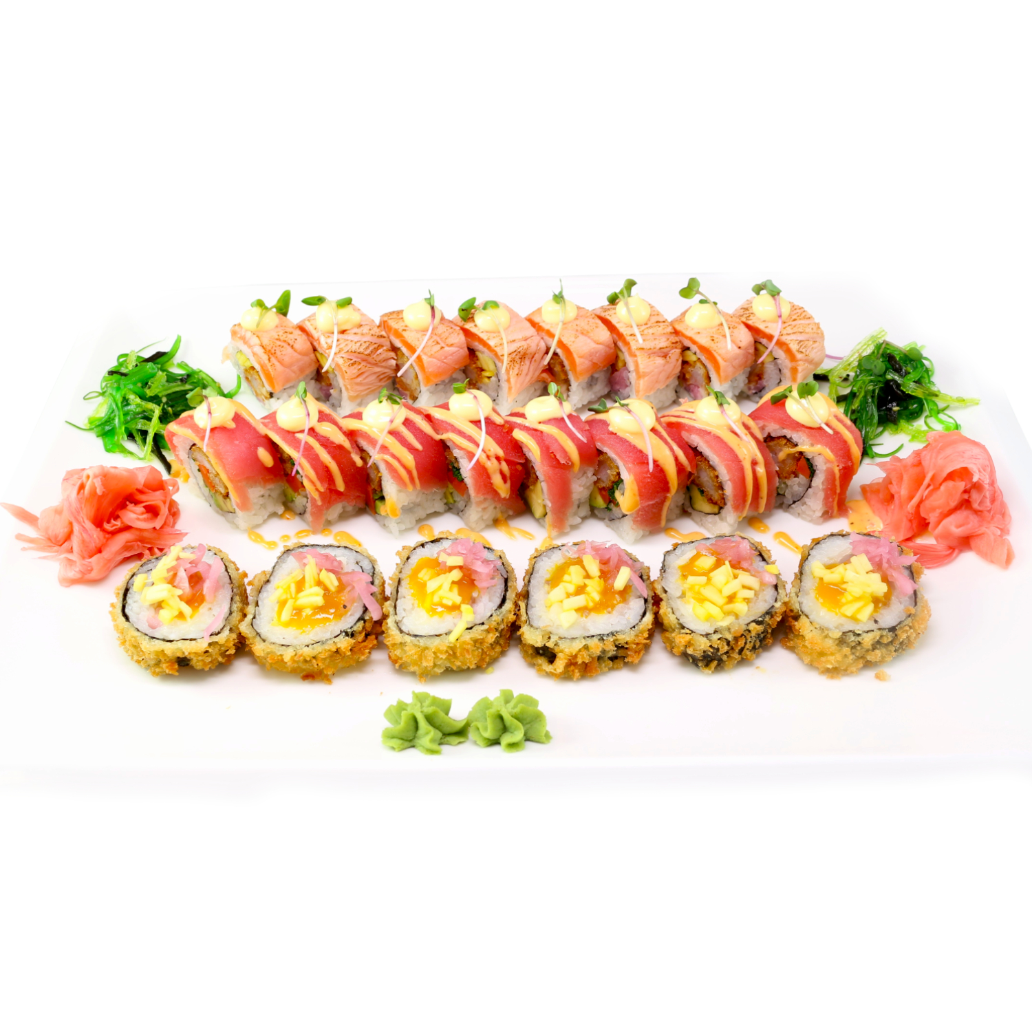 8ks Saké aburi roll, 8ks Kaburi tuniak roll, 6ks Futo panko morský vlk roll, nakladaný zázvor, wasabi, sójová omáčka, goma wakame riasa