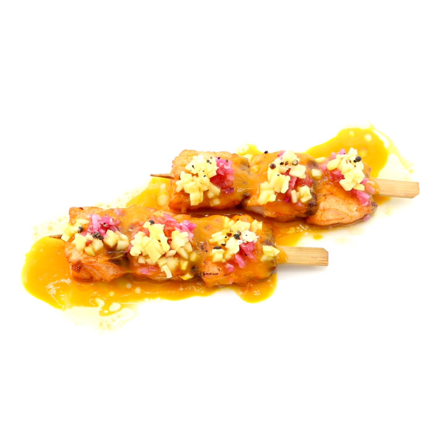 grilovaný lososový špíz, mango omáčka, marinovaná červená cibuľka, teryiaki omáčka, drvené čierne korenie, morská soľ