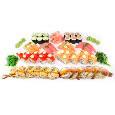 8ks california roll, 8ks philadelphia roll, 6ks Futo panko losos roll, 6ks Futo panko morský vlk roll, 6ks avokádo maki, 6ks losos maki, 4ks Losos nigiri, 4ks Tuniak nigiri, nakladaný zázvor, wasabi, sójová omáčka, goma wakame riasa